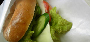 天然酵母使用の葉っぱカフェ自慢のベーグルサンド。サラダ付き
